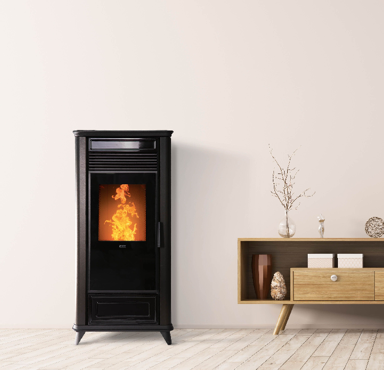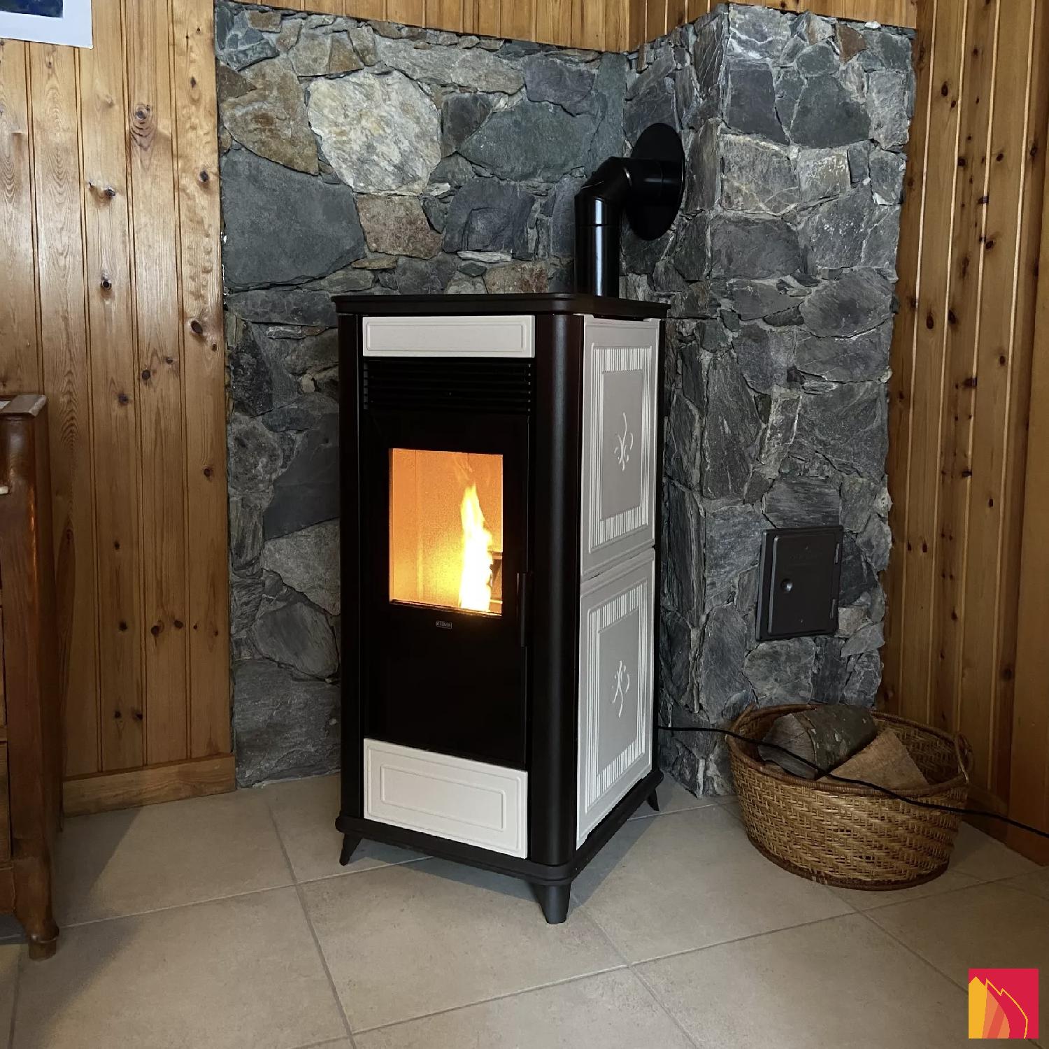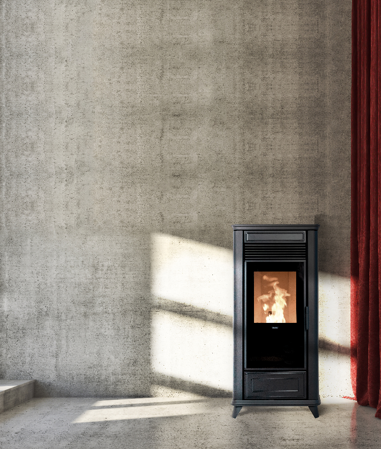 Mit seinem Retro-Look ist der Pelletofen Class Air 90 ein echtes Möbelstück für sich. Auch wenn er nicht massiv im wörtlichen Sinne des Wortes ist, wird dieser Ofen den Platz eines Busses einnehmen. Er ist vollständig mit Keramik verkleidet (burgunderrot, schwarz, elfenbeinfarben oder Speckstein) und lässt durch ein gut platziertes zentrales Fenster viel Platz für die Flamme.