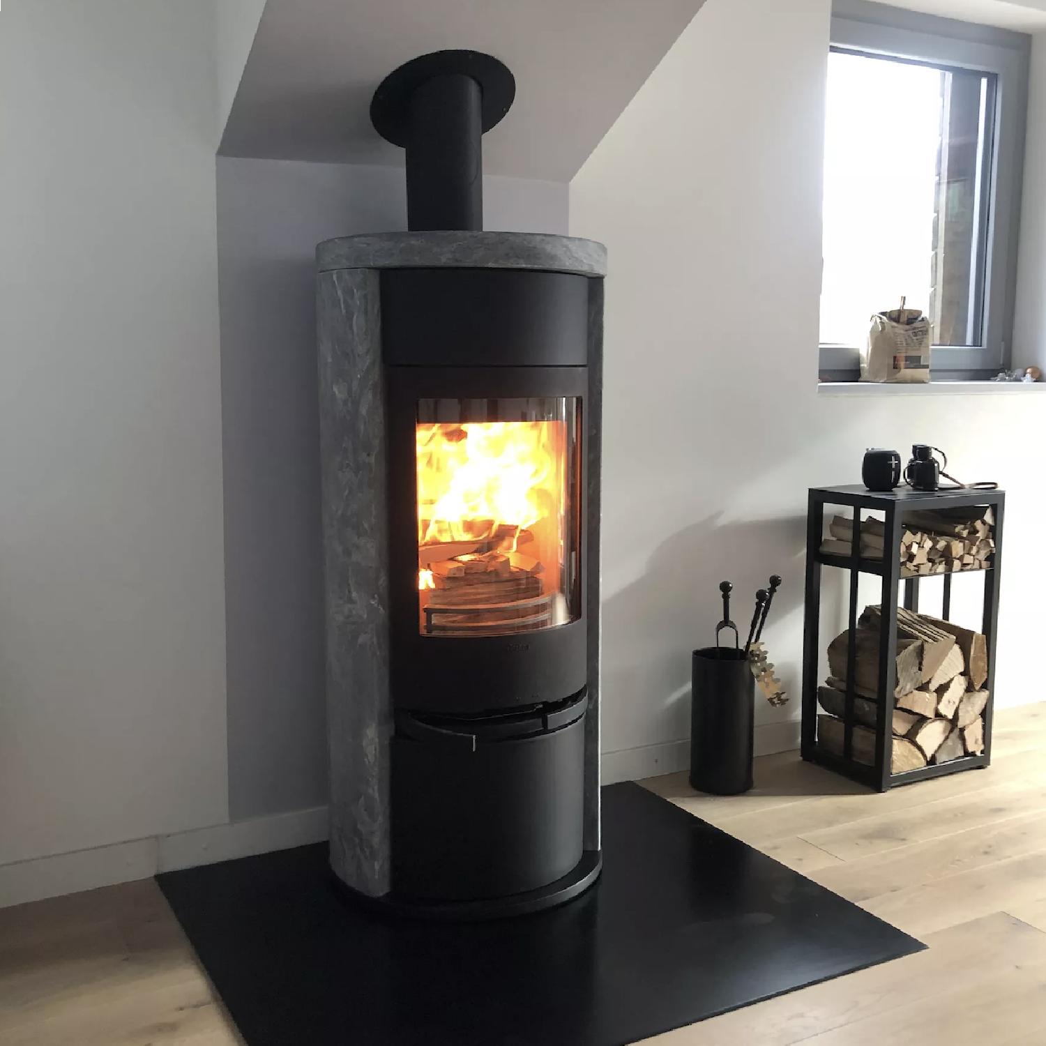 The Contura 620 T wood-burning stove with its large firebox has a strong character. Made of cast iron and soapstone, it has the special feature of continuing to release the gentle heat accumulated during the heating period after the combustion has been stopped. This traditional Swedish wood stove has been redesigned with modern equipment, in a very sober and refined design.
