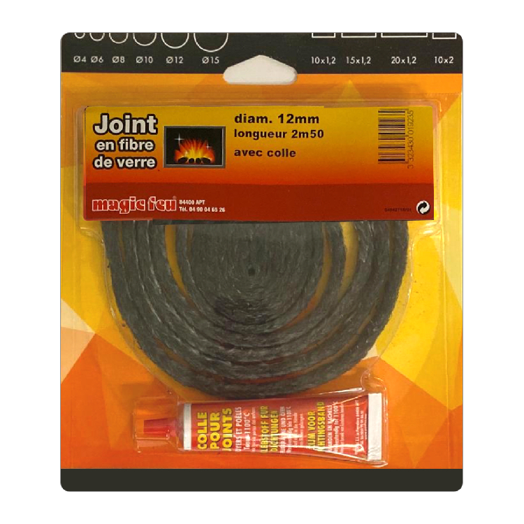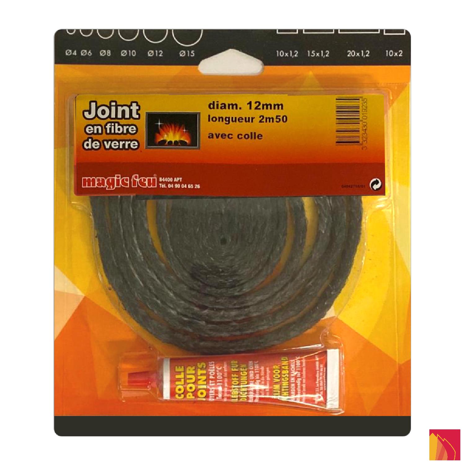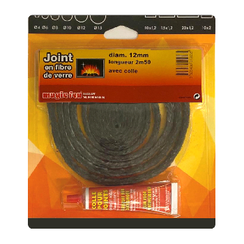 Joint rond en fibre de verre tressée, diamètre 12mm, longueur 250cm, avec tube de colle haute température inclus.