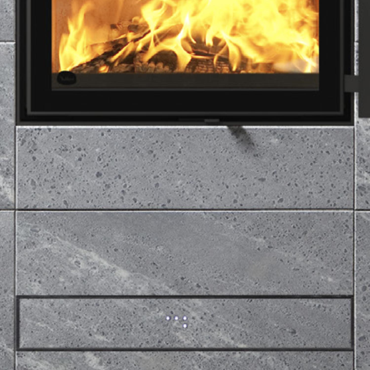 Koli est un poêle minimaliste, dont le trait caractéristique réside dans sa porte rectangulaire orientée verticalement. Les dalles sont agencées en s’alignant sur la porte, ce qui rend l’ensemble encore plus apaisant.