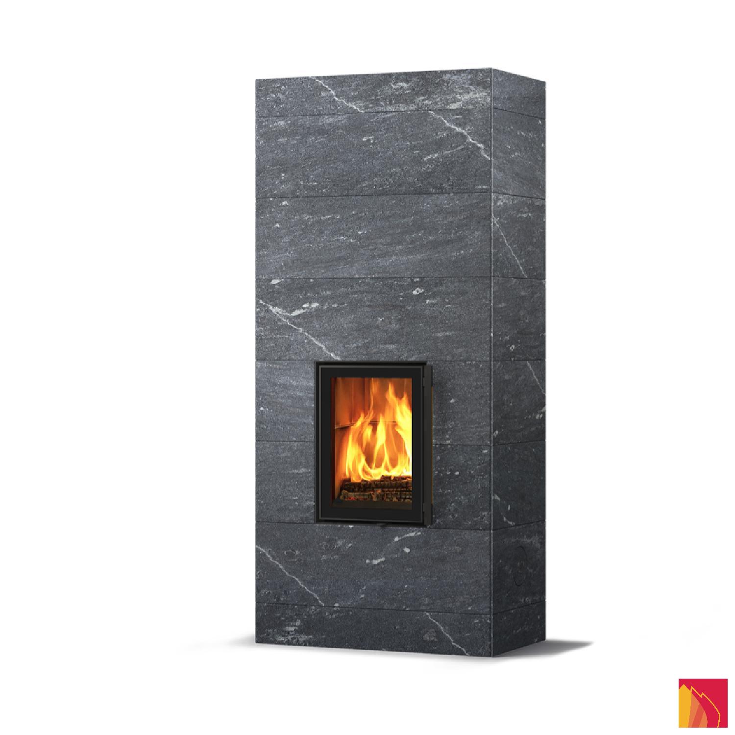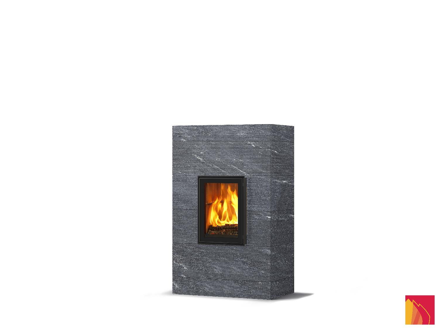 Le revêtement de surface comprend des dalles en stéatite lisses, rainurées ou Grafia avec motifs découpés au jet d’eau. La porte d’aspect moderne dispose d’un fin rebord métallique anthracite et d’un double vitrage.